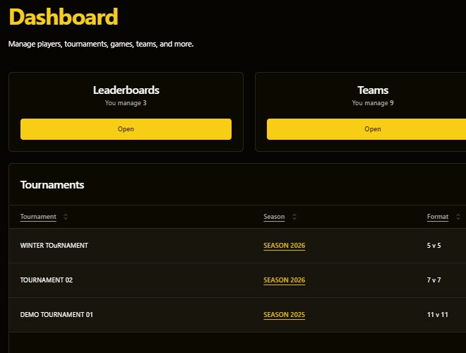 Our real time Google database allows administrators as well as players to see game results, schedule changes, game stats updates in real time. Click a button a let your players be up to date with the latest information from your tournaments!